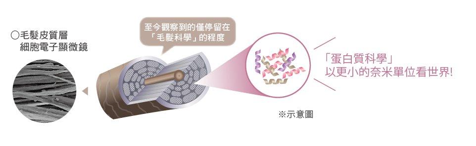 「頭髮,也是蛋白質」挑戰毛髮觀念的新視野,針對「乾硬」「無光澤」「髮色變沉」的課題,藉由蛋白質的構造變化中引導出最佳解決方法。