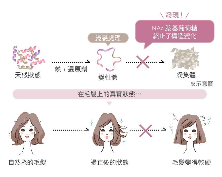 添加終止蛋白質成為變性體的「NAc胺基葡萄糖」於燙劑1劑中,可以有效的減少皮質層的細胞變化。