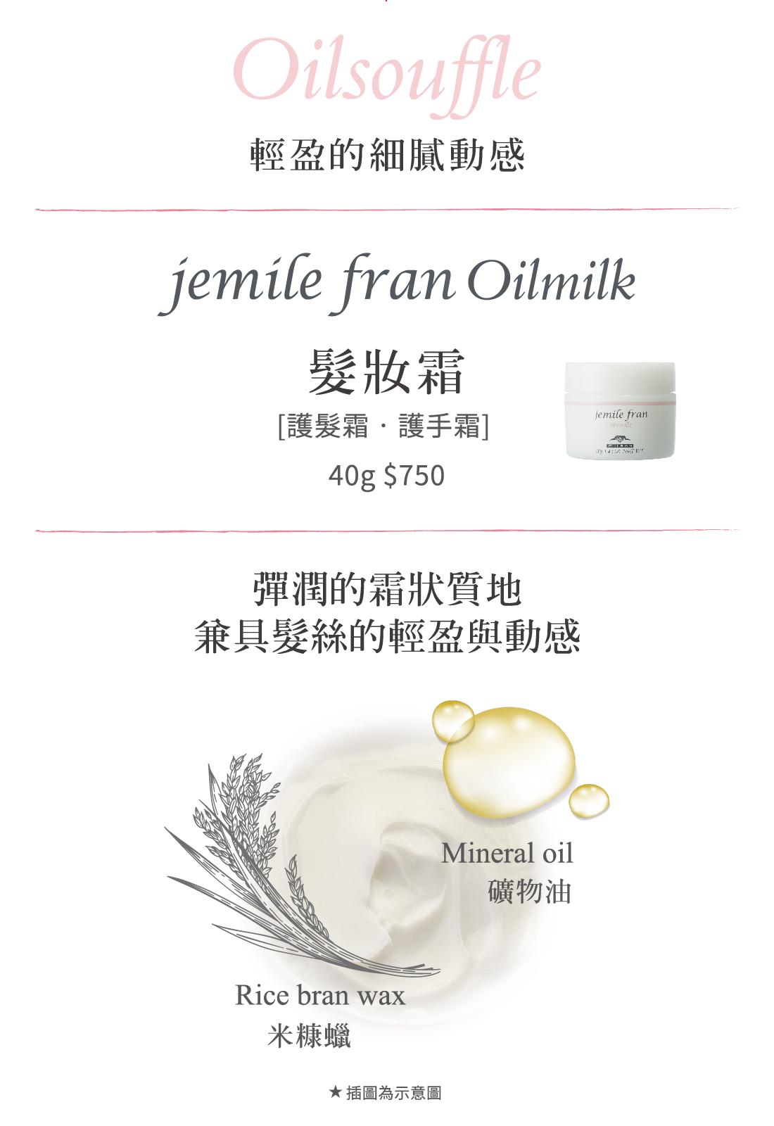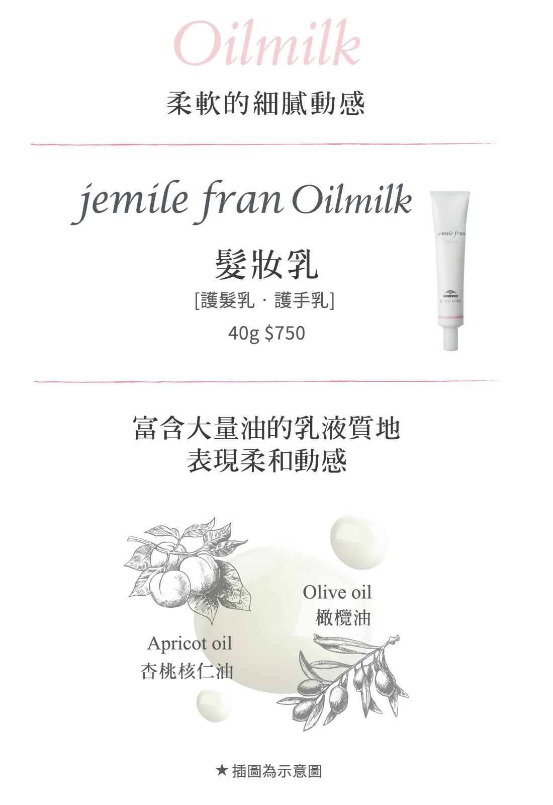 【髮妝乳 Oilmilk】富含大量油的乳液質地,表現柔和動感。
