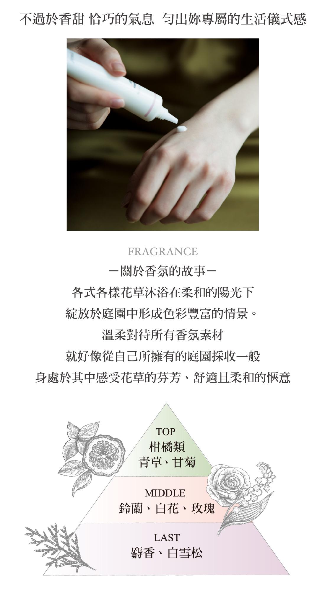 在近距離時才會被察覺的隱約香氣,讓妳更展現自身的與眾不同。